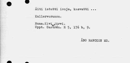 //// Äiti istutti isoja, kasvatti ... //// Kullervorunoa. //// Runa. Ki vi^ ärvi. //// Uppt. Castrén. R 5, 176 b, 9. //// ÅBO RANCKEN MS. ////