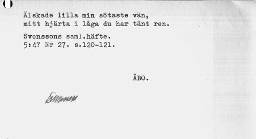 //// t //// Älskade lilla min sötaste vän, mitt hjärta i låga du har tänt ren. //// Svenssons saml.häfte. 5:4? Nr 27. s.120-121. //// ÅBO. //// Jtft&m' ////