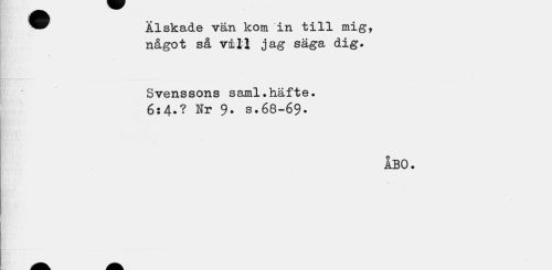 //// ^^ Älskade vän kom in till mig, //// något så vill jag säga dig. //// Svenssons saml.häfte. //// 6:4-? Nr 9. s.68-69. //// ÅBO. ////