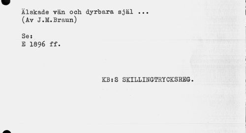 //// Älskade vän och dyrbara själ ... j //// J v //// (Av J.M.Braun) //// ; i //// Se: //// E 1896 ff. //// i //// KB:S SKILLINGTRYCKSREG. //// I' //// i ////