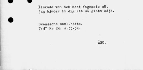 //// Älskade vän och mest fagraste mö, jag bjuder åt dig ett så glatt adjö. //// Svenssons saml.häfte. //// 7:4? Nr 24- s.33-34- //// ABO. ////
