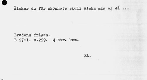 //// Älskar du för skönhets skull älska mig ej då ... //// / //// Brudens frågan. //// B 27:1. s.299» 4 str. kom. //// RA. ////