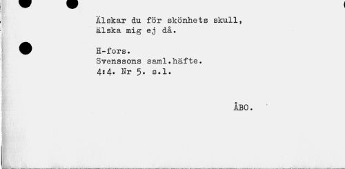 //// Älskar du för skönhets skull, älska mig ej då. //// W H-fors. //// Svenssons saml.häfte. //// 4:4. Nr 5. s.l. //// ÅBO. ' //// Ii t . /v ////