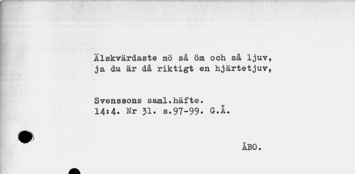 //// * # //// Älskvärdaste mö så öm och så ljuv, ja du är då riktigt en hjärtetjuv, //// Svenssons saml.häfte. //// 14:4. Nr 31. s.97-99» G.A. //// ^ ÅBO. ////