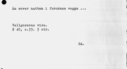 //// I //// An sover natten i furornas vagga ... 1 //// s //// Vallgossens visa. //// B 40, s.33. 3 str. j //// i //// RA. ! //// p //// ¦ ////