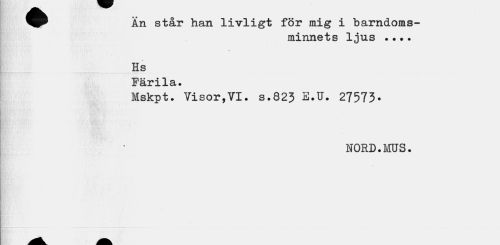 //// ^^ Än står han livligt för mig i barndoms- //// minnets ljus ... //// Hs //// Färila. //// Mskpt. Visor,VI. s.823 E.U. 27573- //// NORD.MUS. ////