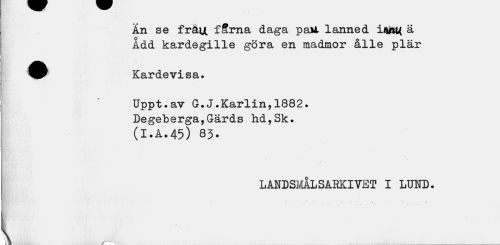 //// Än se fräu fSrna daga paii lanned iwm ä Ådd kardegille göra en madmor ålle plär //// ^^ Kardevisa. //// Uppt.av G.J.Karlin,1882. Degeberga,Gärds hd,Sk. //// (I.A.45) 83. //// * • //// LANDSMÅL SARKI VET I LUND. //// » •. -i r - " Si //// M //// 1 ////