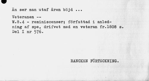 //// Ån ser man utaf åren böjd ... Veteranen — //// W.8.4 - reminiscenser; författad i anledning af spe, drifvet med en veteran fr.1808 s. Del I nr 576. //// v //// RANCKEN FÖRTECKNING. ////