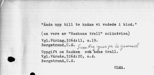 //// ¦ • , v ( //// > //// f^^^W• :v^ff^;- - ¦ r ^•mm4! 't $ fe ^ • " : r ^ If??; ^ //// ¦ //// "Ända upp till te knäna vi vadede i blod." //// " 'f ¦ //// (en vers av "Raskens trall11 soldatvisa) //// Vgl.Väring,3264*11, s.19. //// Bergstrand,C.M. ^ ^^ f£k_ fa ^a^u^ //// Uppgift om Rasken och hans trall. //// ^^ Vgl.Varsås,3264:20, s.4> //// ^^ Bergstrand, C. M. //// ULMA. ////