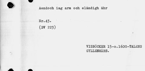 //// ^^ Aendoch iag arm och elandigh ähr //// Nr.43. //// (DV 223) //// * //// VISBÖCKER 15-O.1600-TALENS GYLLENMÄRS. ////