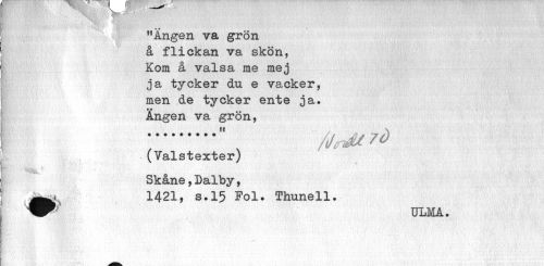 //// v < 11 V, '5® l» > « 1 >' ¦ //// "Ängen va grön å flickan va skön. Kom å valsa me mej ja tycker du e vacker, men de tycker ente ja. Ängen va grön, //// /i/ ^ //// ("Valstexter) //// v . . " . • //// Skåne,Dalby, ^^ 1421, s.15 Pol. Thunell. ////
