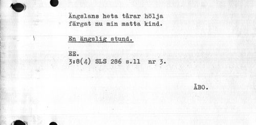 //// Ängslans heta tårar hölja färgat nu min matta kind. //// \ En ängslig stund. //// EE. //// 3:8(4) SLS 286 s.ll nr J. //// ÅBO. //// / //// -- ////
