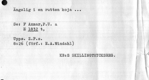 //// G //// Ängslig i en rutten koja Se: F Axmar,P.U. a //// E 1821 t, Upps. Z.P.s. //// 8:26 (förf.: E.Å.Windahl) //// ' 1 r i t A //// KB: S SKILLINGTHYOKSEECr. ; ' //// fl //// -Ék Ml- || //// i \ //// ___1___...-__'___—___---• - ..."' ---r".;;.' --- ffi //// i- ' ^ ////