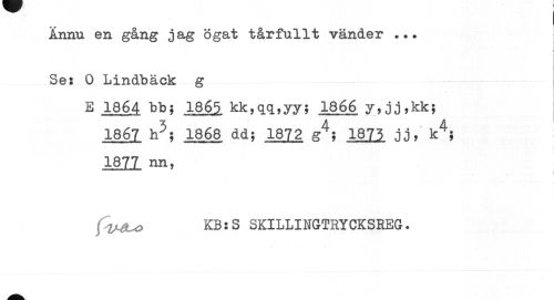 //// Ännu en gång jag ögat tårfullt vänder ... //// Se: O Lindbäck g //// E 1864 bb; 1865 kk,qq,yy; 1866 y,jj,kk; //// 1867 h5; 1868 dd; 1872 g4; 1875 jj, k4; 1877 nn, //// i //// fojuo KB:S SKILLINGTRYCKSREG. ////