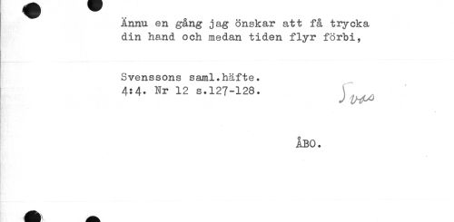 //// Innu en gång jag önskar att få trycka din hand och medan tiden flyr förbi, //// Svenssons saml•häfte• 4:4- Nr 12 s.127-128. //// ? yTA^ //// ÅBO. ////