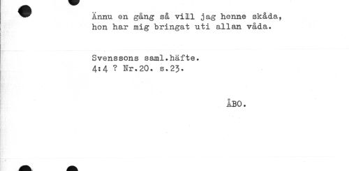 //// ^^ Ännu en gång så vill jag henne skåda, //// hon har mig bringat uti allan våda. //// Svenssons saml.häfte. 4:4 ? Nr.20. s.23. //// ÅBO. ////