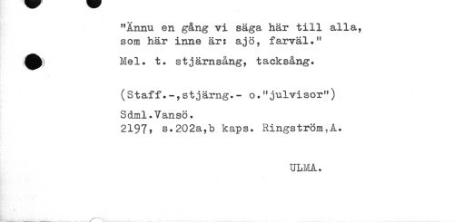 //// "Ännu en gång vi säga här till alla, som här inne är: ajö, farväl." //// Mel. t. stjärnsång, tacksång. //// ( S t af f. -, s t j ärng. - o. " julvi sor11) Sdml.Vansö. //// 2197, s.202a,b kaps. Ringström,A. //// ULMÅ. //// / \ ////