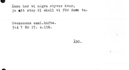 //// Ännu har vi nägra s ty ver kvar, ja ett stop öl skall vi för dem ta. //// Svenssons saml•häfte. 3:4 ? Nr 27. s.158. //// . . » //// åbo. //// i- ////