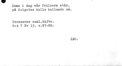 //// Ännu i dag vår Frälsare står, på Golgatas kulle kallande så. //// Svenssons saml.häfte. //// 6:4 ? Nr 13. s.87-88. //// åbo. ////