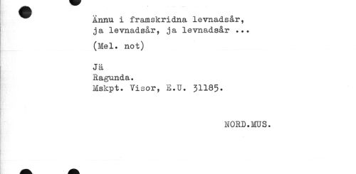 //// Ännu i framskridna levnadsår, ja levnadsår, ja levnadsår ... //// (Mel. not) Jä //// Ragunda. //// Mskpt. Visor, E.U. 31185. //// NORD.MUS. ////