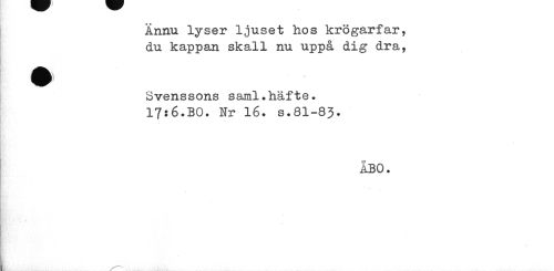 //// Ännu lyser ljuset hos krögarfar, du kappan skall nu uppå dig dra, //// Svenssons saml.häfte. 17:6.BO. Nr 16. s.81-83. //// abo. ////