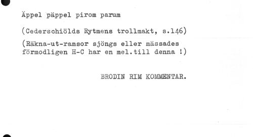 //// Äppel päppel pirom parum //// (Cederschiölds Rytmens trollmakt, s.146) //// (Räkna-ut-ramsor sjöngs eller mässades förmodligen H-C har en mel.till denna i) //// BRODIN RIM KOMMENTAR. ////