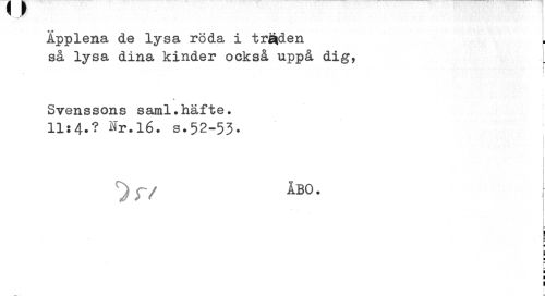 //// ¦.. /T //// Äpplena de lysa röda i träiden //// så lysa dina kinder också uppå dig, _ //// \ //// i //// Svenssons saral.häfte. 11:4.? Nr.16. s.52-53. //// 1 //// 1 //// c)r/ ÅB0- //// 'e //// E H //// ii //// c //// i 1 I ////
