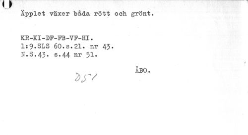 //// Äpplet växer båda rött och grönt. KR-KI-DF-FB-VF-HI. //// 1:9.SLS 60.S.21. nr 43. //// N.S.43* s.44 51* //// ¦ //// ¦ F ¦ //// ÅBO. //// 2>y ////