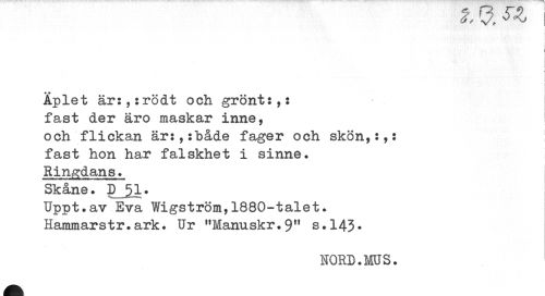 //// I ¦ //// i //// Äplet är:,:rödt och grönt:,: //// fast der äro maskar inne, //// och flickan är:,:både fager och skön,:,: //// fast hon har falskhet i sinne. //// Ringdans. //// Skåne. D Jl. //// Uppt.av Eva Wigström,1880-talet. Hammarstr.ark. Ur "Manuskr.9" s.143- //// NORD.MUS. ////