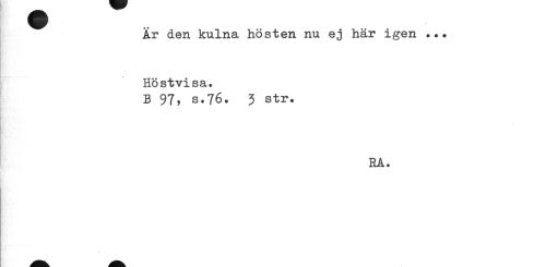//// Är den kulna hösten nu ej här igen ••• Höstvisa. //// B 97, s.76. 3 str. //// RA. ////