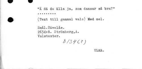 //// f,Ä dä du älla ja, som dansar så bra?" //// (Text till gammal vals) Med mel. Smål.Tävelås. //// 2634*8. Strömberg,A. Valstexter. //// &/2>?0) //// ULMå. //// _ ////