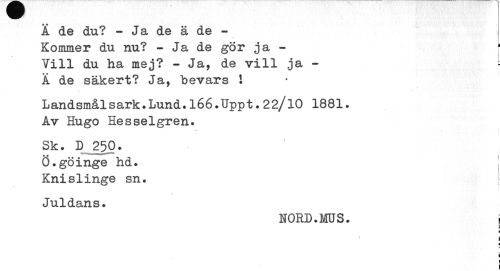 //// Ä de du? - Ja de ä de - //// Kommer du nu? - Ja de gör ja - [ //// Vill du ha mej? - Ja, de vill ja - t //// Ä de säkert? Ja, bevars ! //// L andsmåls ark.Lund.16 6.Upp t.2 2/10 1881. Av Hugo Hesselgren. //// i //// Sk. D 250. Ö.göinge hd. Knislinge sn. //// Juldans. //// NORD.MUS. j //// i 1 //// I i //// ¦ //// ¦ //// i i ////