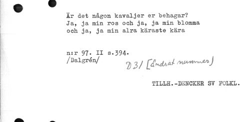 //// Är det någon kavaljer er behagar? Ja, ja min ros och ja, ja min blomma och ja, ja min alra käraste kära //// n:r 97. II s.394* //// /Dalgrén/ ^ ^ y ^^J //// TILLH.-DENCKER SY FOLKL. ////