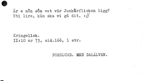 //// År e non söm vet vär Junkårflickon ligg? Uti lire, kam ska vi gå dit, :// //// Kringellek. //// 11:10 nr 73, sid.166, 1 str. //// FORSLUND. MED DALÄLVEN. ////