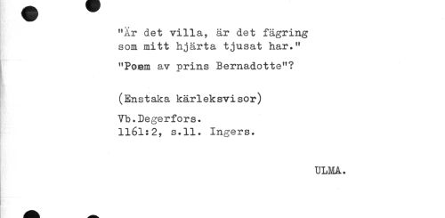 //// "Är det villa, är det fägring som mitt hjärta tjusat har." //// "Poem av prins Bernadotte"? //// (Enstaka kärleksvisor) //// Vb.Degerfors. //// 1161:2, s.ll. Ingers. //// ULMÅ. ////