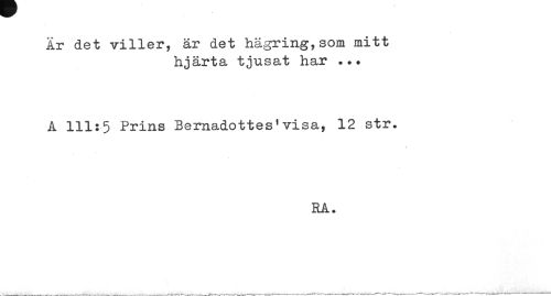 //// Ar det viller, är det hägring,som mitt //// hjärta tjusat har ... //// a 111:5 Prins Bernadottes1visa, 12 str. //// ra. ////