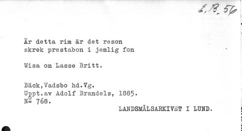 //// I //// i //// j //// i l i i //// Är detta rim är det reson skrek prestabon i jemlig fon //// Wisa om Lasse Britt. //// BäckjYadsbo hd.Vg. //// Uppt.av Adolf Brandels, 1885• //// n2 768. | //// LANDSMÅLSARKIVET I LUND. j //// B //// - //// m ¦ //// ät Wk ////