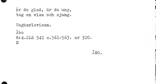 //// I //// Ar du glad, är du ung, tag en visa och sjung. //// Ungkarlsvisan. j //// Åbo //// 8:4-SLS 542 s.561-563. nr 320. j //// N " //// 1 //// ÅBO. ! //// r //// L //// i: ////