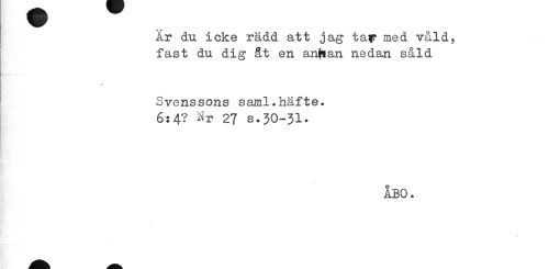 //// År du icke rädd att ja g tar nied våld, fast du dig åt en anjsan nedan såld //// » //// Svenssons saml.häfte. 6:4? Hr 27 s.JO-Jl. //// ÅBO. ////