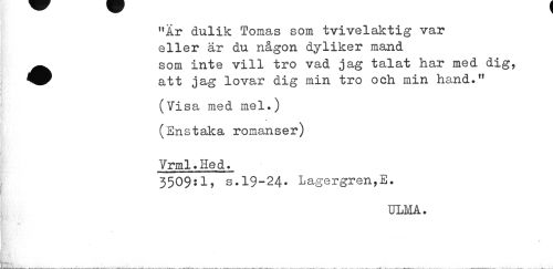 //// "Är dulik Tomas som tvivelaktig var eller är du någon dyliker mand ^^ som inte vill tro vad jag talat har med dig, //// ^^P att jag lovar dig min tro och min hand." //// (Yisa med mel.) //// (Enstaka romanser) //// Vrml.Hed. //// 3509:1, s.19-24. Lagergren,E. //// ULMA. //// vi* . * ////