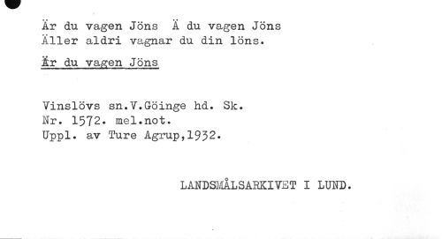 //// Är du vägen Jöns Ä du vägen Jöns Åller aldri vagnar du din löns. //// £r du vägen Jöns //// Vinslövs sn.V.Göinge hd. Sk. //// Hr. 1572. mel.not. //// Uppl. av Ture Agrup,1932. //// LANDSMALSÅHKIVET I LUND. ////