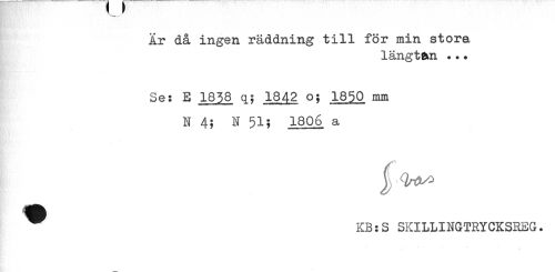//// Är då ingen räddning till för min stora //// längtan ... //// Se: E 1858 q; 1842 o; 1850 mm //// 14; Ji 51; 1806 a //// KB:S SKILLINGTRYCKSREG. ////