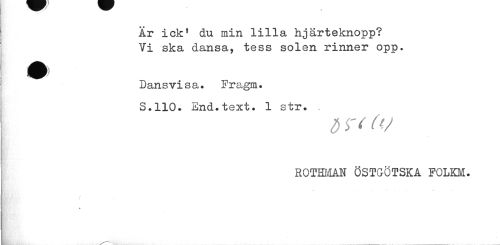 //// Är ick1 du min lilla hjärteknopp? Vi ska dansa, tess solen rinner opp. //// ) //// Dansvisa. Fragm. S.110. End.text. 1 str. . //// b r < (</ //// ROTHMAN ÖSTGÖTSKA FOLKM. //// _ ////