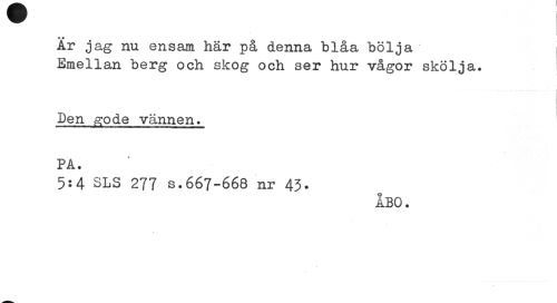 //// Är jag nu ensam här på denna blåa bölja Emellan berg och skog och ser hur vågor skölja. //// Den gode vännen. PA. //// 5:4 SLS 277 S.667-668 nr 43. //// ÅBO. ////