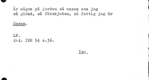 //// Är någon på jorden så ensam som jag ' //// så glömd, så förskjuten, så fattig jag är //// Ensam* //// LP. S //// 4:4. INE 94 s.36. //// 1 //// 1 //// åbo. : //// 1 //// ¦ ¦ ////