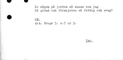 //// 9 //// År någon på jorden så ensam som jag Så glömd och förskjuten så fattig och svag? //// ^ EE. //// 4:4* Brage 5* s*7 nr 3* //// ÅBO. ////