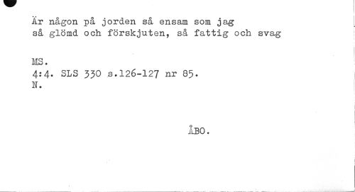 //// År någon på jorden så ensam som jag så glömd och förskjuten, så fattig och svag //// i //// MS. //// 4:4. SLS 33O s.126-127 nr 85. N. //// i I //// åbo. //// i 1 ////