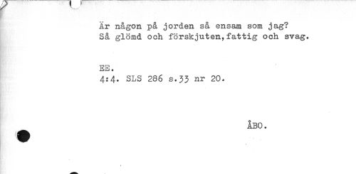 //// Är någon på jorden så ensam som jag? Så glömd och förskjuten, fattig och svag. //// EE. //// 4:4. SLS 286 s.33 nr 20. //// 9 iBO. //// % ////