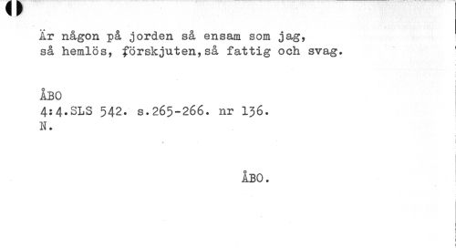 //// Är någon på jorden så ensam som jag, så hemlös, förskjuten, så fattig och svag. //// : i //// Å30 //// 4:4.SLS 542. s.265-266. nr 136. N. //// • I //// ÅBO. //// I ////
