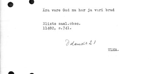 //// Ära vare Gud nu har ja vari brud Blixts saml.obsc. //// 11482, s.741. //// ULMA. ////